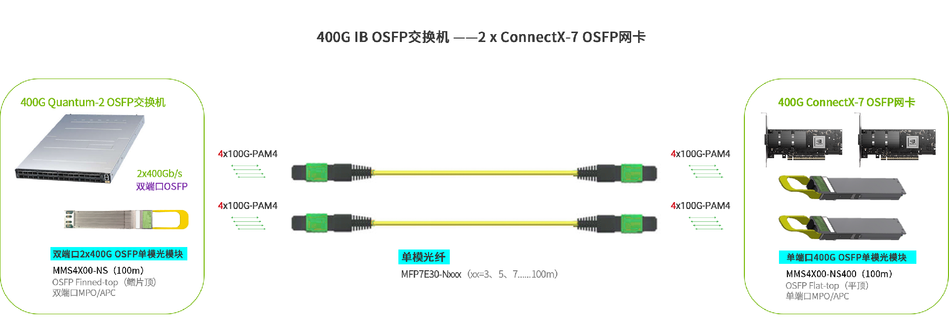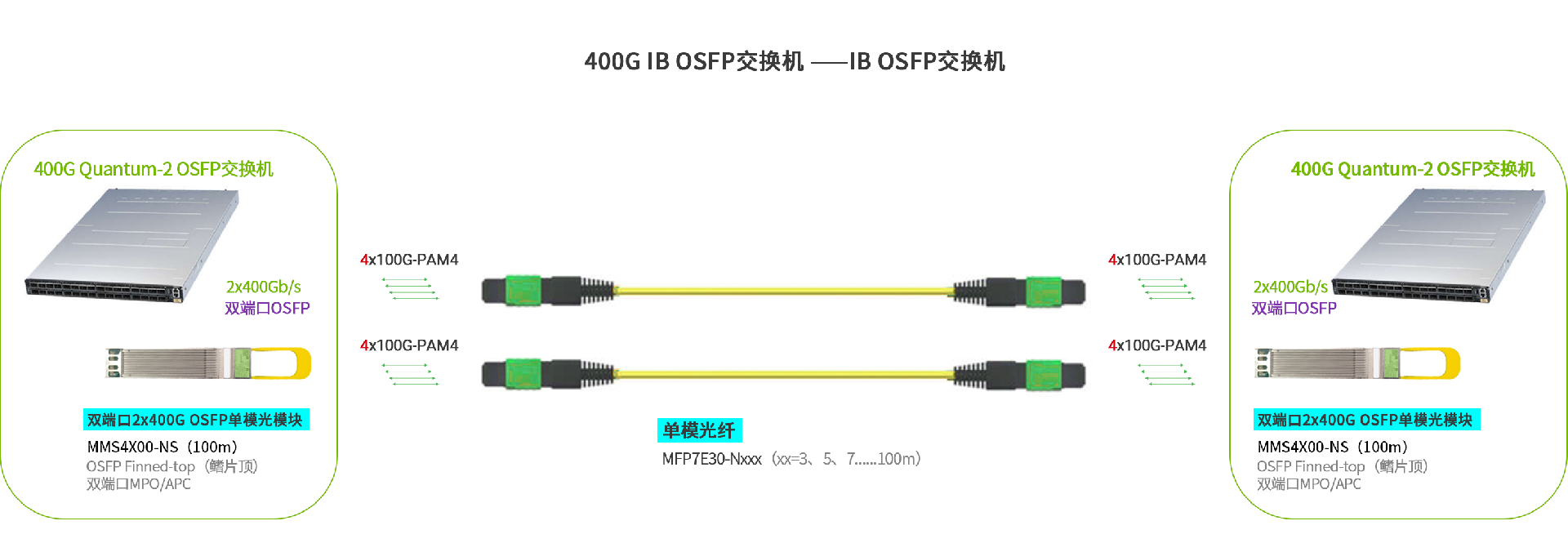 NVIDIA/Mellanox MMS4X00-NS 是一款 InfiniBand (IB) 和以太網 (ETH) 2x400Gb/s 雙端口 OSFP、DR8單模、并行8 通道收發器,使用兩個 4 通道 MPO-12/APC 光纖連接器,每個連接器速度為 400Gb/s,采用 100G-PAM4 調制,最大傳輸距離100 米。主要用于Quantum-2 InfiniBand交換機之間互連或交換機到兩個400Gb/s ConnectX-7 OSFP網卡。