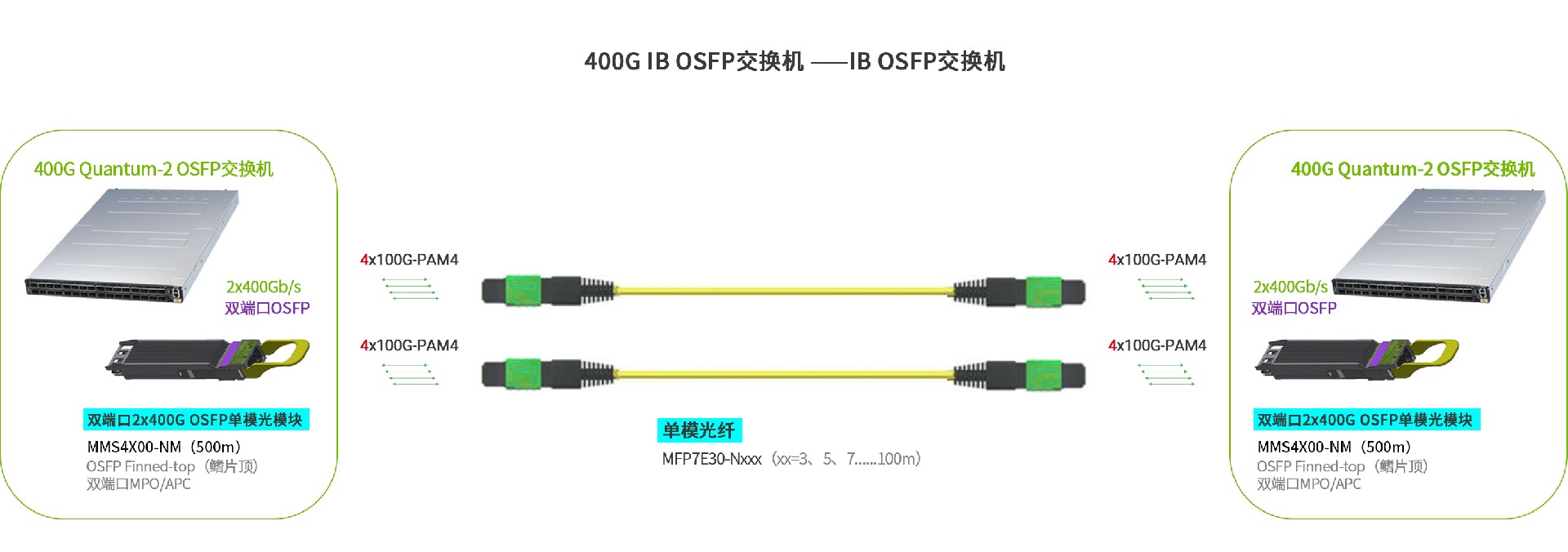 NVIDIA/Mellanox MMS4X00-NM 是一款 InfiniBand (IB) 和以太網 (ETH) 2x400Gb/s 雙端口 OSFP、DR8單模、并行8 通道收發器,使用兩個 4 通道 MPO-12/APC 光纖連接器,每個連接器速度為 400Gb/s,采用 100G-PAM4 調制,最大傳輸距離500 米。主要用于Quantum-2 InfiniBand交換機之間最遠500m距離互連。